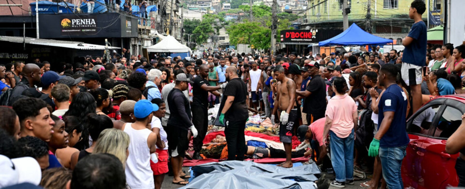 Foto: Moradores ficam ao lado de corpos alinhados na Praça São Lucas, na favela Vila Cruzeiro, no Complexo da Penha, no Rio de Janeiro, Brasil, em 29 de outubro de 2025, após a Operação Contenção. – PABLO PORCIUNCULA / AFP